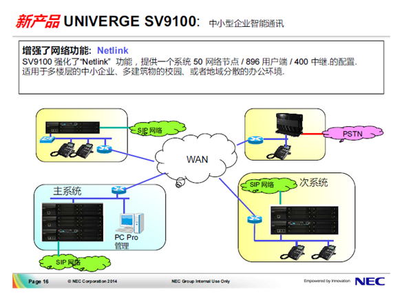 SV9100 強(qiáng)化了“Netlink” 功能,提供一個(gè)系統(tǒng) 50 網(wǎng)絡(luò)節(jié)點(diǎn) / 896 用戶(hù)端/400 中繼.的配置.