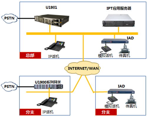U1981作為核心語(yǔ)音網(wǎng)關(guān),為全網(wǎng)用戶提供呼叫控制業(yè)務(wù)。分支節(jié)點(diǎn)可根據(jù)用戶需求選擇一款U1900系列網(wǎng)關(guān)實(shí)現(xiàn)本地語(yǔ)音接入,提供語(yǔ)音本地再生能力。