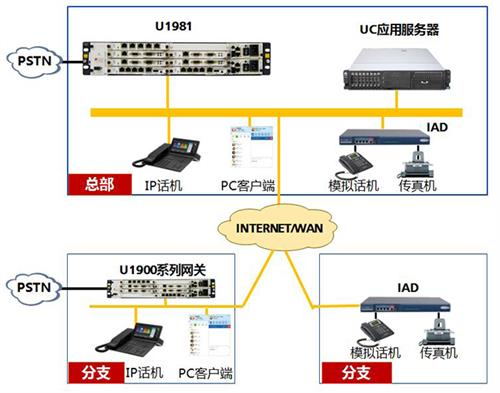 U1981可作為統(tǒng)一通信核心語(yǔ)音網(wǎng)關(guān),總部部署1套U1981和UC應(yīng)用服務(wù)器,實(shí)現(xiàn)SIP話機(jī)、模擬話機(jī)、PC客戶端、移動(dòng)客戶端等多種終端語(yǔ)音互通和語(yǔ)音會(huì)議,以及狀態(tài)呈現(xiàn)、即時(shí)消息、多媒體會(huì)議等UC應(yīng)用業(yè)務(wù),提升溝通效率。分支節(jié)點(diǎn)可根據(jù)規(guī)模選擇U1900系列網(wǎng)關(guān),作為本地語(yǔ)音網(wǎng)關(guān),提供語(yǔ)音的本地再生能力。